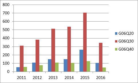 台湾智慧財産局(台湾の知的財産権主務官庁。日本の特許庁に相当)の専利データベースで検索した統計結果に基づくと、台湾はフィンテック関連分野において、2011年から毎年公開∕公告された専利件数は明らかに年々増加しており(図1)、特にマーケティング、買物、請求、競売又は電子商取引の専利(IPC国際分類番号:G06Q30)においては、さらに2015年には700件を超える専利が公開∕公告された。